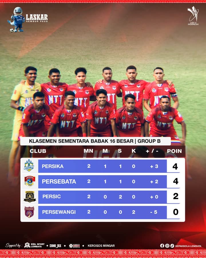 Laskar Persebata Lembata Hari ini akan melakoni laga terakhir pada babak 16 besar kontra Persika Karanganyar di Stadion Bantul Yogyakarta pukul 16-00 WITA. Rabu 14 Mei 2025.