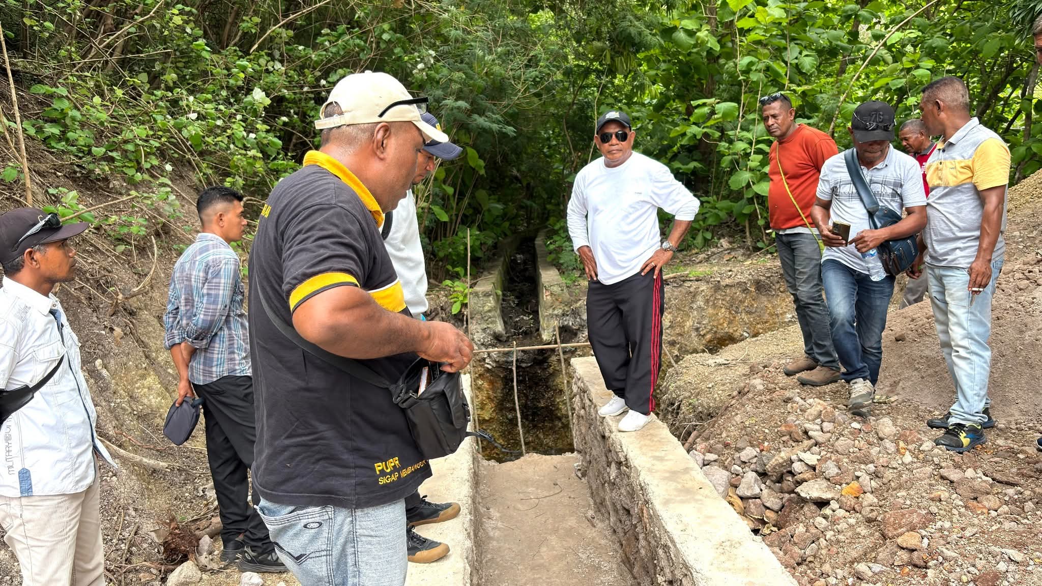Setelah meninjau kondisi lahan pertanian di Desa Bean, Bupati Lembata, P. Kanisius Tuaq, melanjutkan agenda dengan berjalan kaki menyusuri area saluran air dan bendungan desa. Dalam peninjauan langsung tersebut, Bupati memastikan debit air yang mengalir ke lahan pertanian serta mengecek secara detail kerusakan pada bendungan maupun saluran distribusi air.