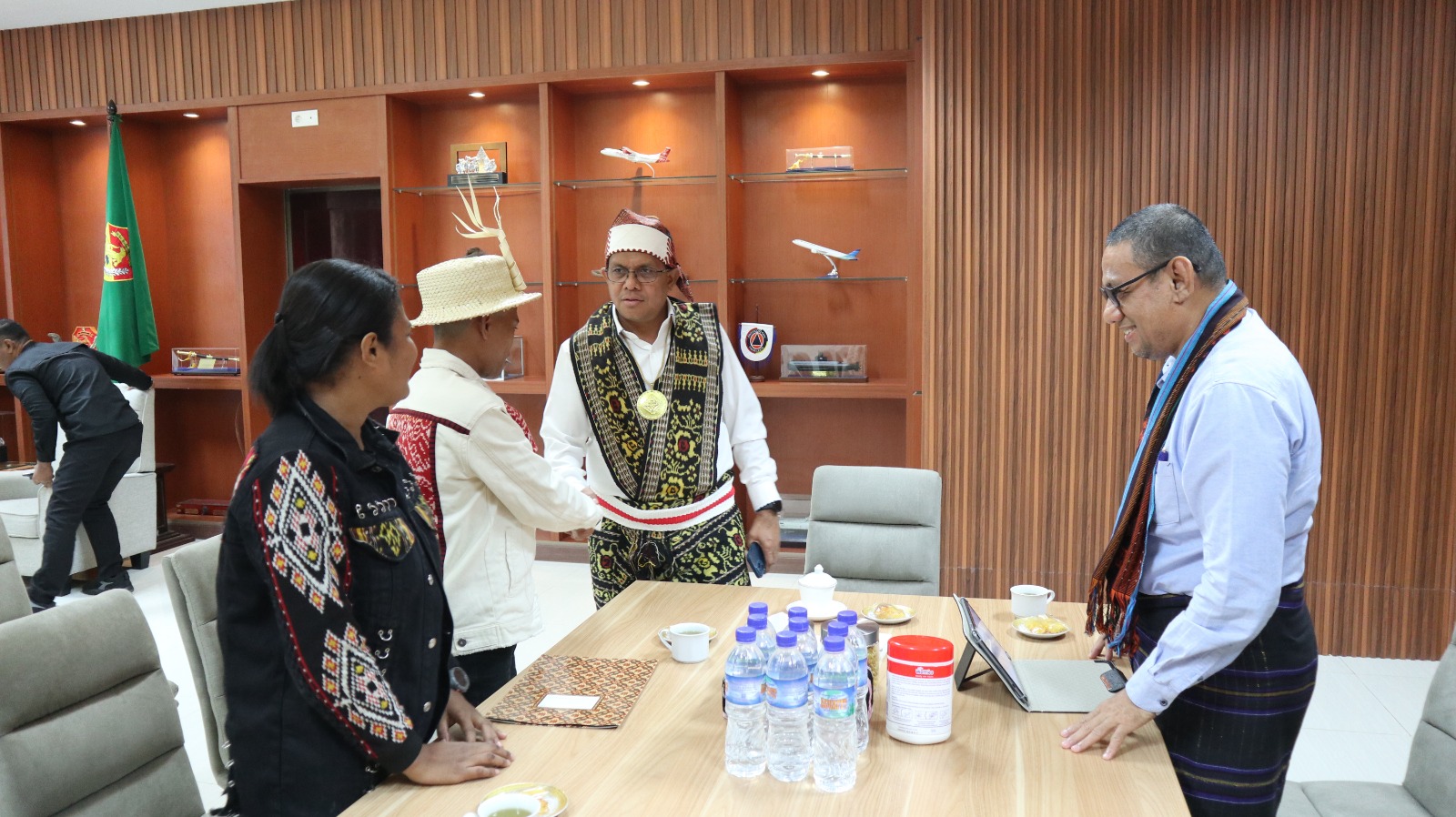 Gubernur NTT, Emanuel Melkiades Laka Lena menerima audiensi dengan Djitron Koriyon Pah (Seniman Musisi Sasando) dan Noverda Tse (Desainer Tenun Ikat), di Ruang Kerja Gubernur, Jumat (2/5/2025). Turut mendampingi Gubernur NTT yakni, Kadis Pariwisata dan Ekonomi Kreatif NTT, Noldy Pelokila.