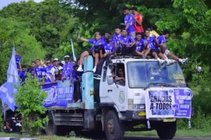 Tampak Ribuan warga, yang tergabung dalam komunitas suporter fanatik ‘Lomben Mania’, memadati pelabuhan dari pagi hingga siang hari, membawa spanduk, bendera, dan genderang, menyambut para pahlawan lapangan hijau bak tentara yang pulang dari medan perang.